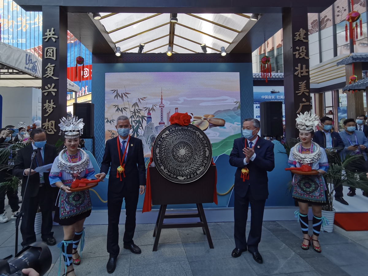 11月5日上午,隨着廣西壯族自治區副主席周紅波與中國國際進口博覽局財務總監馬鳳民共同敲響開館銅鼓,拉開帷幕,廣西綜合館和廣西老字號精品館在第三屆中國國際進口博覽會中揭開神秘面紗。