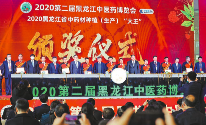 在2020年黑龍江省中藥材種植(生產)颁奖仪式上,依安县领军中草药种植农民专业合作社联合社理事长梁作晖(左八)被授予「關防風種植大王」。(石启立 摄)