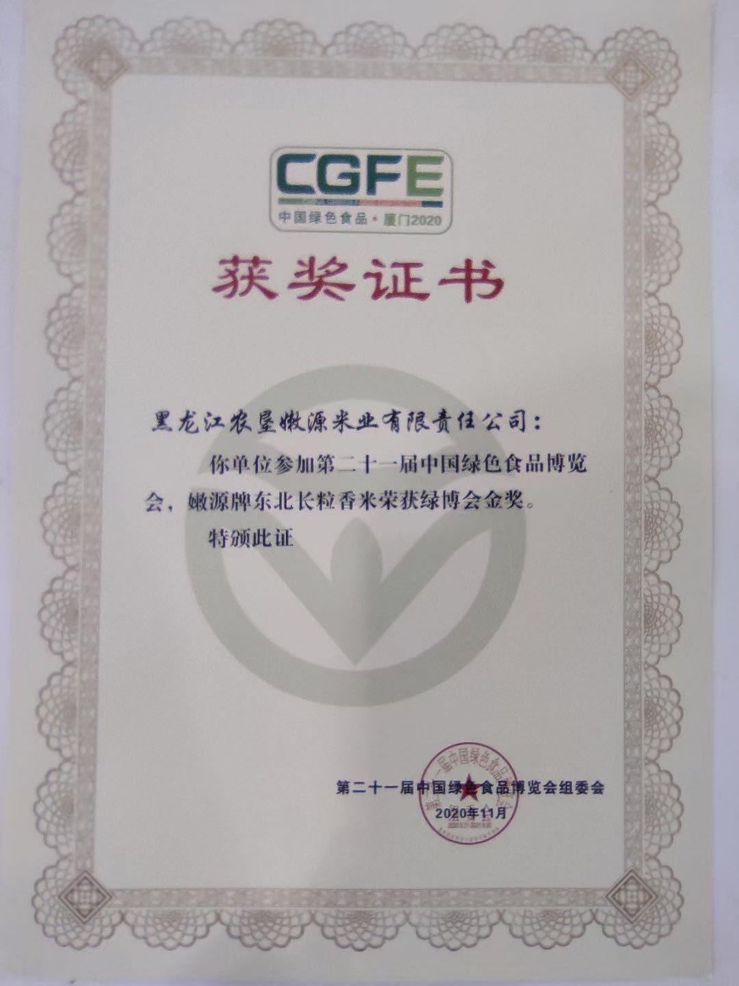 近日,在廈門召開的第二十一屆中國綠色食品博覽會上,黑龍江農墾嫩源米業有限責任公司的嫩源牌東北長粒香米榮獲綠博會金獎。