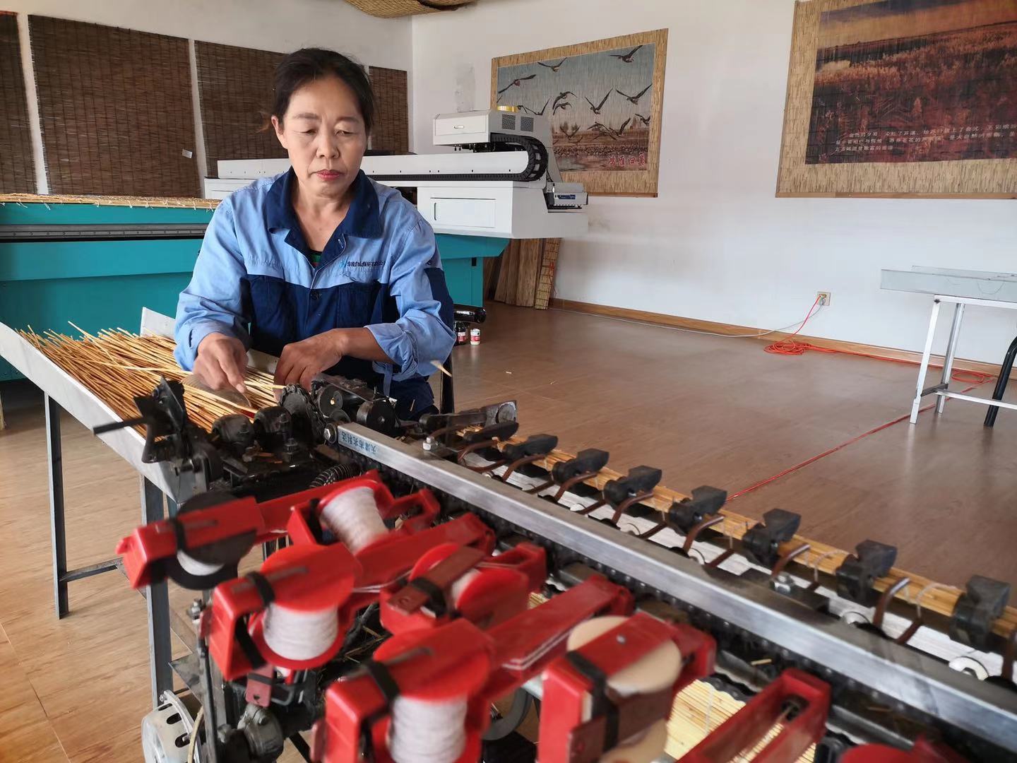一手穩外貿,一手拓展國內市場。在產業園葦簾展示大廳里看到,各式各樣的葦簾樣品掛滿了展廳的牆。一台智能噴繪機正在工作,不到半個鐘頭,丹頂鶴翩翩起舞的畫面在葦簾上鮮活呈現。