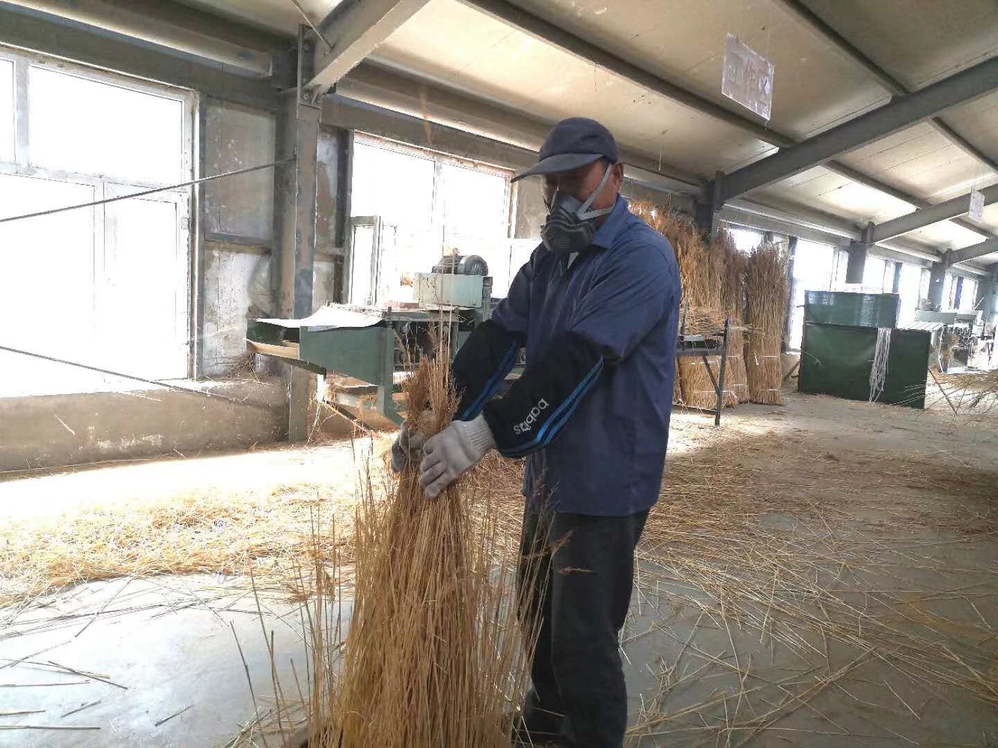 坐落在小河東村南郊的蘆葦產業園的原料加工車間裏,機器聲陣陣轟鳴。55歲的王勇抱起一捆葦稈放入去皮機,咋齒輪轉動下,沒一會兒就吐出一支支去掉外皮的淨稈。之後王勇再按照淨稈長短進行人工分揀。經過處理後的淨稈隨後裝車,被運送到全縣的各個村屯。