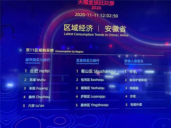 今年的天貓「雙11」首迎加長版,第一波活動的餘溫還未散去,第二波活動又接踵而至,國民消費欲望持續全面釋放。從2020天貓全球狂歡季11月11日12點02分50秒發佈的「雙11」區域購買榜來看,合肥市位列安徽省城市購買力排行榜第一位。蜀山區繼續領跑,位列安徽省區縣購買力榜單第一位,成為全省「買買買」的主戰場。