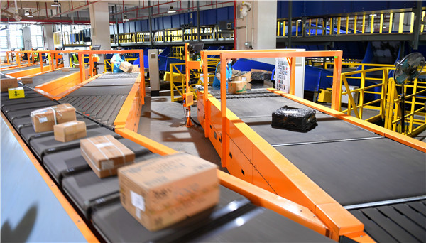 在現場可以看到,郵件處理系統全部採用自動化流水線,郵件從卸車到分揀,再到歸集裝車,全部在傳送帶上完成。車間內,高低兩層的傳送帶載着郵件快速運轉,智能識別系統會根據預先設定好的程序,智能掃描運單並按照運輸目的地進行分類,再由傳送帶將歸集成包的郵件運送至裝車口。
