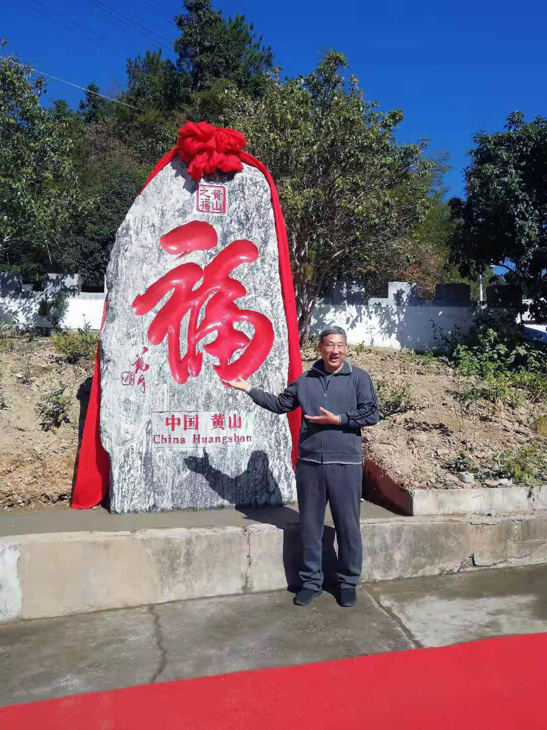 來自山東泰安的遊客祝先生剛從黃山遊玩下來,恰巧遇見了新國線換乘中心出口處景觀石刻“福”字的落成儀式,開心地成為第一位“打卡”留影的遊客。祝先生說:“遊黃山天氣晴好,見到了藍天下最美的風景。下山後又遇見‘福’字新立,這一次遊黃山真是太有福氣了!”(記者 吳敏 通訊員 程勇軍)