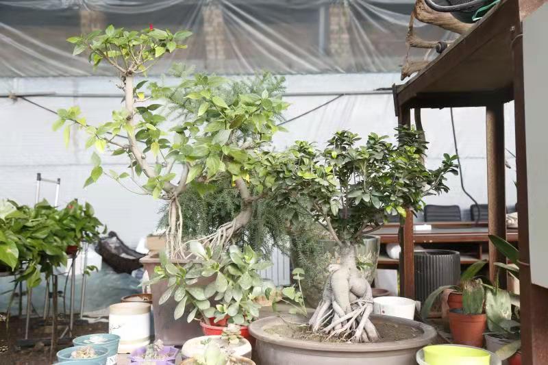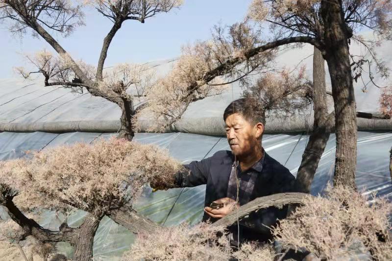 看完小型盆栽,我們又跟隨張躍進來到室外的幾株大型盆栽。三春柳(檉柳),別名垂絲柳,枝幹遒勁,姿態婆娑,這也是近些年張躍進在大型盆栽方面的研究方向。為此,他多次深入山林、河溝、荒地和汾河灘,尋找適合做大型景觀樹的檉柳。談及近期因為幾棵檉柳由於種種原因未到他手裡做成大型盆景,張躍進的臉上滿是遺憾。