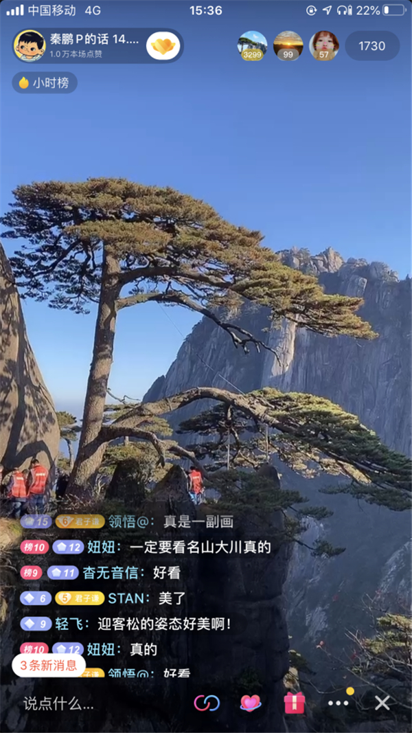 陽光大片的灑在山川草木間,一切看起來都是那麼的生機勃勃,絲毫沒有秋末冬初的蕭瑟,沐浴在陽光下的迎客松也蒼勁有力,屹立在萬丈懸崖的上方,讓人心生敬畏。直播間的觀眾不禁感歎,黃山處處有風景,時時有風景。