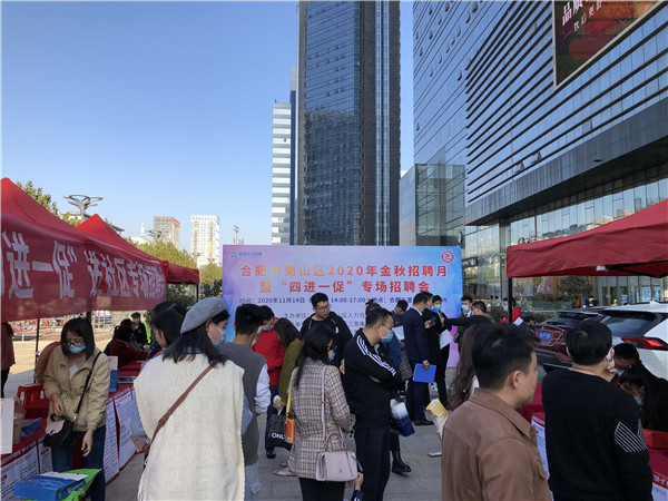 日前,在合肥市三里庵之心城廣場,蜀山區金秋招聘月暨「四送一促」專場招聘會舉行。此次招聘會吸引了80多家企業參加,提供崗位數超2500個,涵蓋金融、製造、服務、文秘等多個種類。「想找個實習生崗位鍛煉自己,這樣對以後發展會有幫助。今天的招聘會提供的崗位特別多,很適合這樣剛出來實習的大學生。」安徽農業大學大四學生唐果說道。