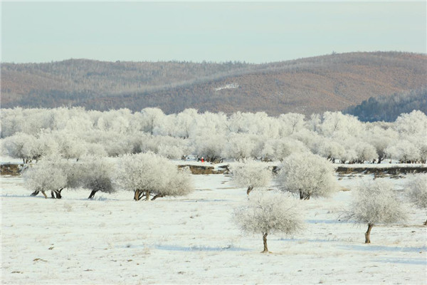 回到故鄉的返鄉遊客黃如新開心的說,「好幾年沒回咱們呼瑪了,回到呼瑪一看這美景,特漂亮,特別是這個霧凇,掛樹上白白的,像雪花可美了,今天沒啥事,領着我嬸和我叔出來到江邊看一看。」