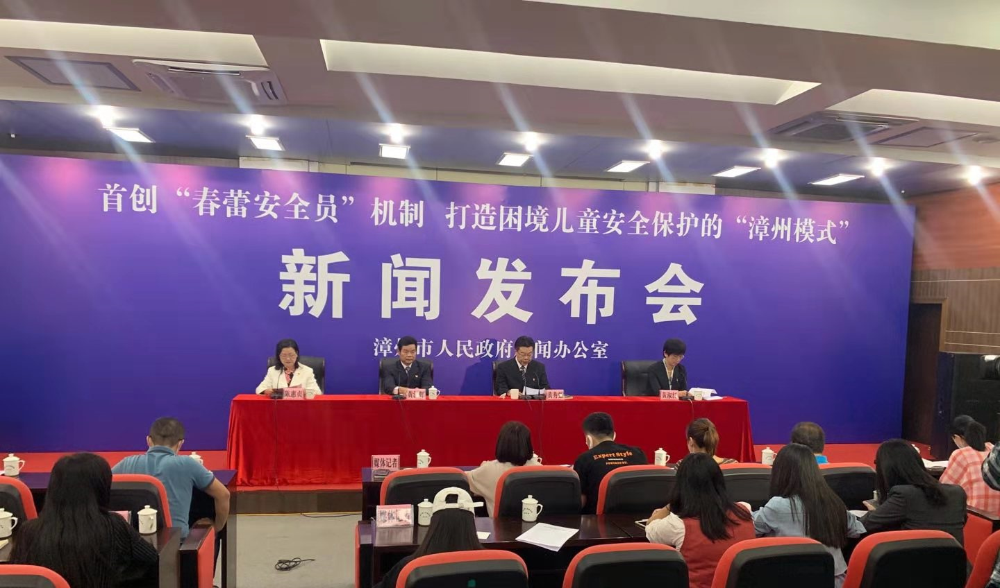 11月17日上午,福建漳州市舉行「首創『春蕾安全員』機制,打造困境兒童安全保護的『漳州模式』」新聞發佈會。市人民檢察院黨組書記、檢察長黃秀強和市婦聯主席黃淑紅、市教育局局長黃江輝出席發佈會並答記者問,市委宣傳部副部長陳惠貞主持會議。