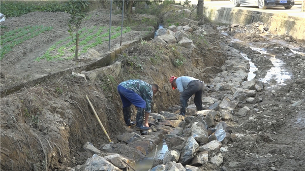 在閃裏鎮文堂村汪頭畈高標準農田项目施工現場,施工人員正忙著開挖溝渠、襯砌邊坡。今年投資近55萬元,對這條400多米長的水渠進行修復,通過清淤拓寬、挖深修底,改善溝渠蓄排水功能,解決農田水渠排水難、灌溉難的問題。