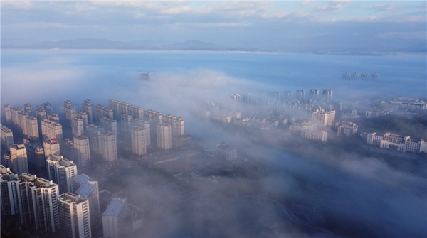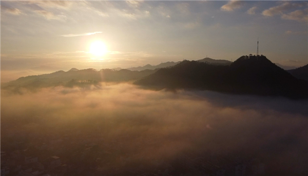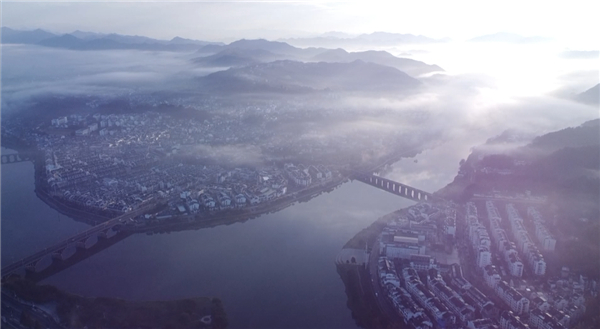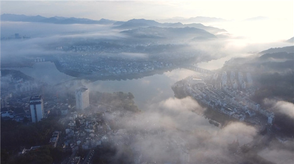 11月18日,雨後放晴的清晨,正是觀看雲海日出的最佳時機。清晨6點,從空中俯瞰,漫漫雲海在歙縣縣城的座座山峰間奔湧,時如飄逸的輕紗,時如滾滾波濤,蔚為壯觀。不一會兒,遠處的太陽冉冉升起,金色的晨光破開雲層,朝霞映紅了整片雲海,給整個城市鍍上一層奪目的金色。在清晨朝暉的渲染下,一簇簇白霧如玉帶般環繞整個城區,河流、高樓、橋樑在白霧中,若影若現,十分唯美。(記者 吳敏 通訊員 淩利兵 胡發正)