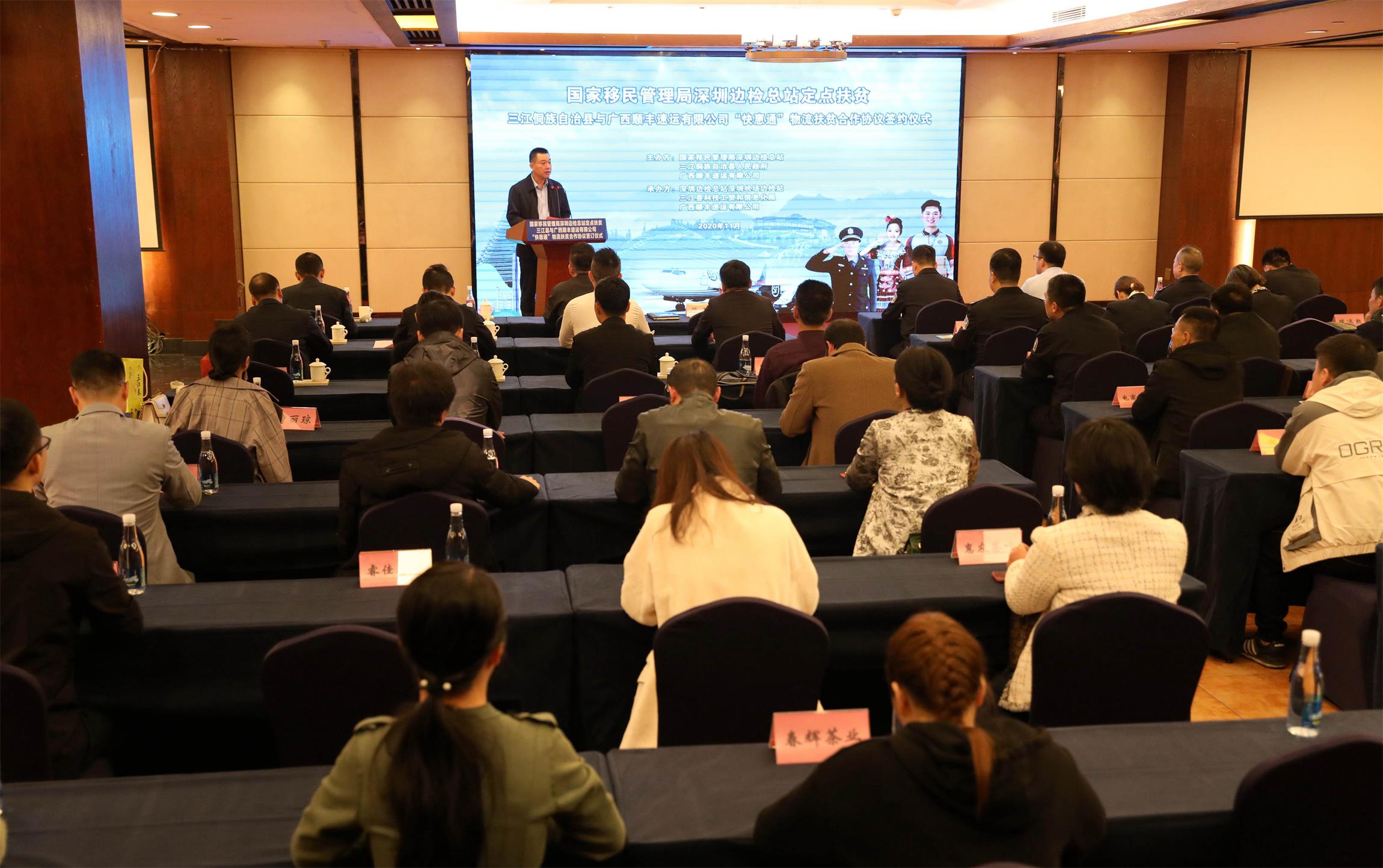 國家移民管理局深圳邊檢總站黨委副書記、副總站長苟高榮在致辭中指出,國家移民管理局深圳邊檢總站在下好「精準棋」幫扶貧困村的同時,全力打好「整體戰」,着力從銷售渠道、物流成本和產品品牌三個方面幫扶三江做大做強特色產業。深圳機場邊檢站在對口幫扶同樂苗族鄉歸美村的過程中,了解到村民農產品銷路難、物流費用高等問題後,積極聯繫廣西順豐速運有限公司,多次開展調研,最終促成了「快惠通」物流扶貧項目落地三江,有效打通了侗鄉農產品銷售的「最後一公里」。