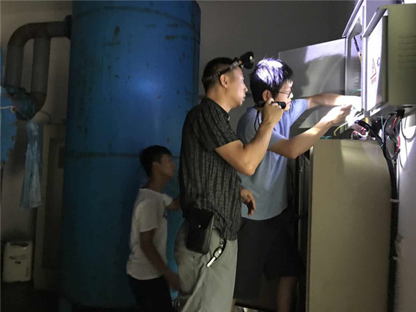 淩亮(右)和同事進行設備檢修