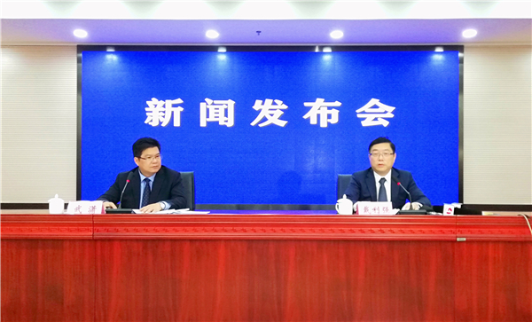 安徽省中小微企業綜合金融服務平台建設工作新聞發佈會現場,安徽省委宣傳部新聞發佈處處長武瀟(左)主持發佈會,省地方金融監管局副局長戴利強介紹相關情況(孫軍/攝)