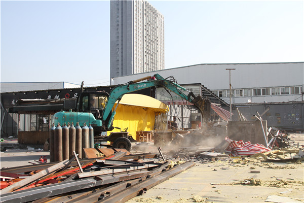 「起初,當事人持觀望態度,沒有主動拆除。我們組織執法人員多次上門宣傳教育,耐心做當事人的思想工作,在我們的堅持下,終於說服了當事人自拆。」高新區城管局負責人說道。「我們始終堅持勸說為先,自拆為主,強拆為輔,對於自拆的商家,我們也安排執法人員現場輔助。」隨後,伴隨着機器轟鳴聲,廠區內違法搭建的混凝土牆體被一一推倒,支架被逐一切割搬離。