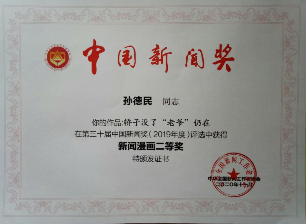 由中華全國新聞工作者協會主辦的第三十屆中國新聞獎、第十六屆長江韜奮獎評選結果日前揭曉。河南省漫畫家協會簽約漫畫家孫德民的作品《轎子沒了「老爺」仍在》喜獲第三十屆中國新聞獎新聞漫畫二等獎。