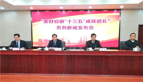 「美好安徽『十三五』成就巡禮」系列新聞發佈會(第四場),左起:安徽省委宣傳部新聞發佈處處長武瀟主持發佈會,省委農辦主任、省農業農村廳廳長盧仕仁, 省農業農村廳副廳長王華,省農業農村廳副廳長王紅先後介紹有關情況並回答記者提問(孫軍/攝)