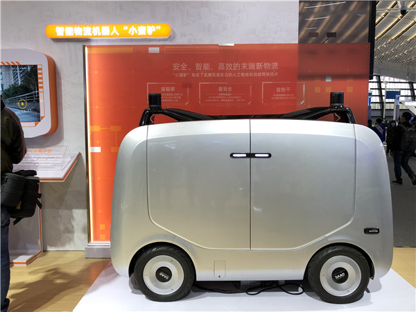 圖為阿里巴巴首次在展會上展示的2020年雲棲大會線上發佈的物流機器人「小蠻驢」,集成達摩院最前沿的人工智能和自動駕駛技術,提供安全、智能、高效的末端物流服務。(記者 張夢琪)