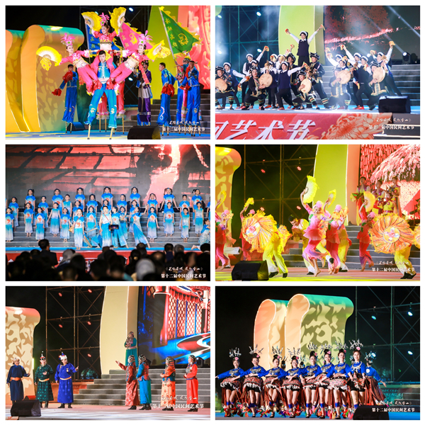 開幕式演出由「小康圓夢」、「多彩神州」、「山花競放」三個篇章組成。參演節目有來自陝北的安塞腰鼓、來自雪域高原的西藏民歌、來自白山黑水的達斡爾族傳統舞蹈、來自福建的原生態畲族歌言、來自貴州苗族「嘎鬧」支系的錦雞舞、來自天涯海角的海南黎族打柴舞……34支民間文藝表演隊伍接連登場,為現場近千名觀眾聯袂奉獻了地域風格濃厚的高水平民間歌舞表演。