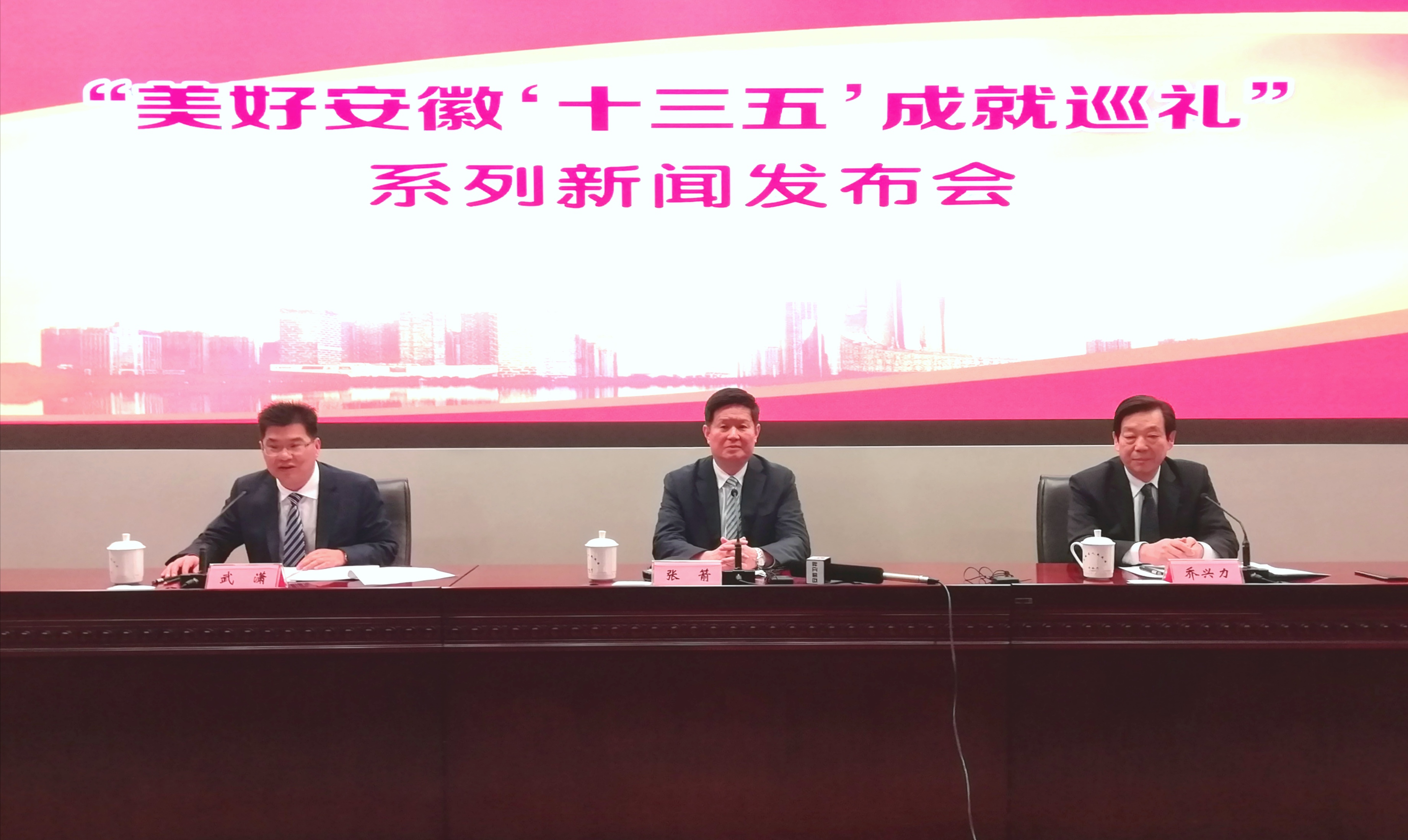 「美好安徽『十三五』成就巡禮」系列新聞發佈會(第五場),左起:安徽省委宣傳部新聞發佈處處長武瀟主持發佈會,省商務廳廳長張箭,省商務廳副廳長喬興力先後介紹有關情況並回答記者提問(孫軍/攝)