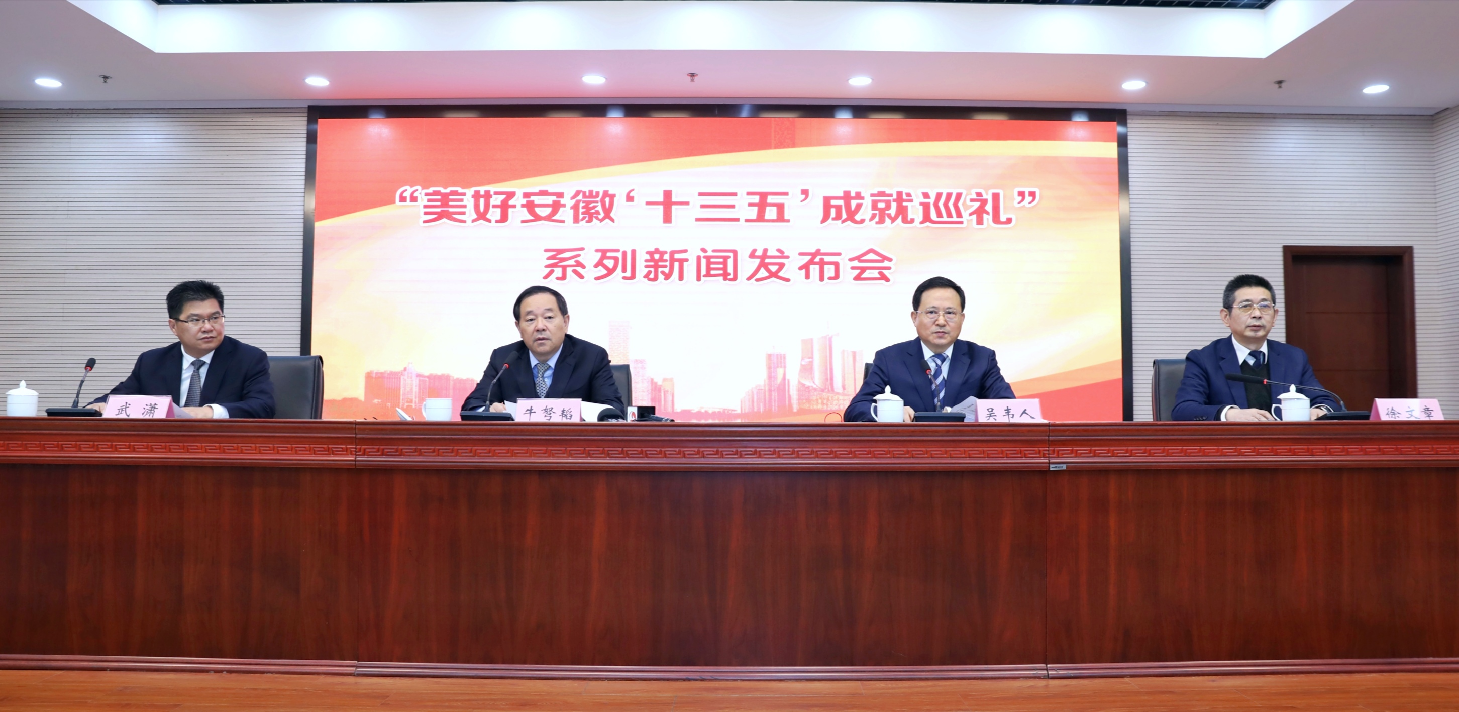 「美好安徽『十三五』成就巡禮」系列新聞發佈會(第六場),左起:安徽省委宣傳部新聞發佈處處長武瀟主持發佈會,省經濟和信息化廳廳長牛弩韜,副廳長吳韋人,總工程師徐文章先後介紹相關情況並回答記者提問