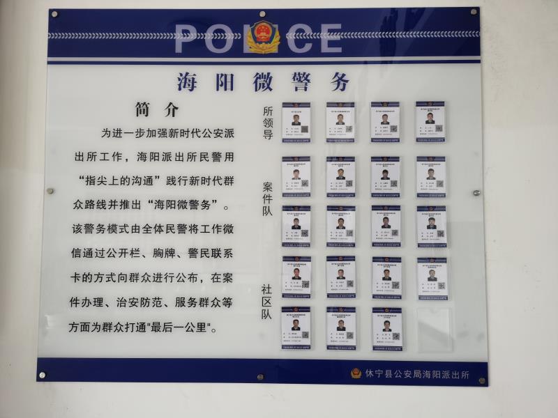安徽黃山市休寧縣公安局海陽派出所創新性開展“微警務”工作模式,全體民警將工作微信通過公開欄、胸牌、聯繫卡的方式向群眾予以公佈,在案件辦理、治安防範、服務群眾等方面通過“指尖上的溝通”打通服務群眾“最後一公里”。10月份以來,已有400餘名群眾添加民警微信,共收到各類線索25條,協助破獲案件3起,為群眾辦好事實事32件。