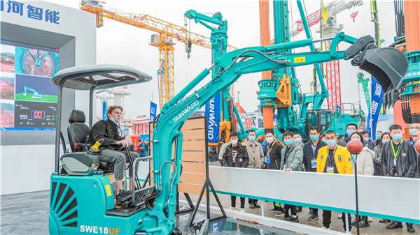 山河智能的智能挖掘機產品吸引了大量參展者圍觀