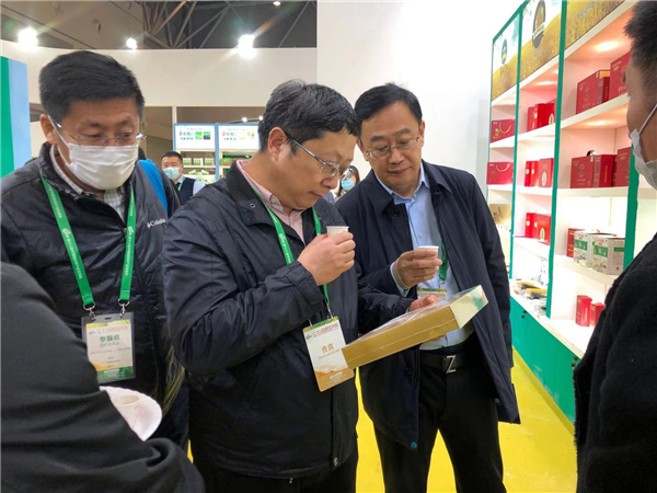 黑龍江省農業農村廳二級巡視員顧毅(右二)、黑龍江省農業農村廳市場處處長郭紹權(右一)在展館與參展企業交流
