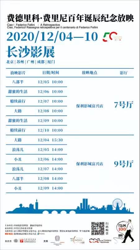 這一影展即將來到長沙。12月4日至10日,6部由費里尼執導的經典影片將在長沙保利影城富興店展映,分別是《大路》《八部半》《浪蕩兒》《甜蜜的生活》《小丑》《船續前行》。
