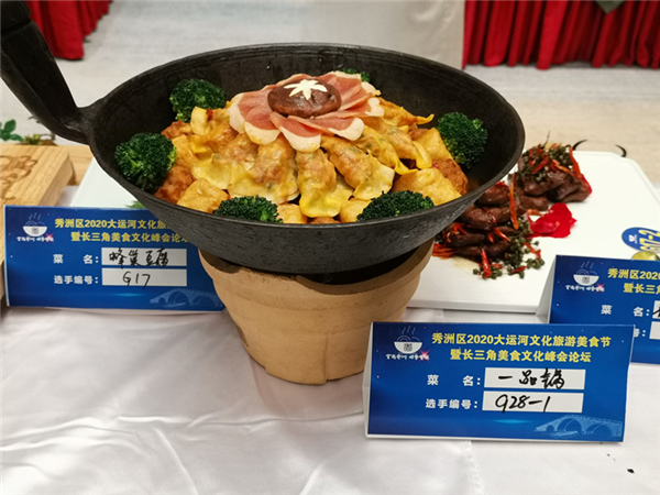当天現場有八寶全鴨、秘制老鵝等家常菜組成的江南秀水宴,也有以三塔、蓮泗蕩、落帆亭等運河沿線景點為創意製作的菜肴,還有毛豆腐、臭鱖魚等傳統菜肴。菜品豐富,色澤鮮豔,讓人眼花繚亂。