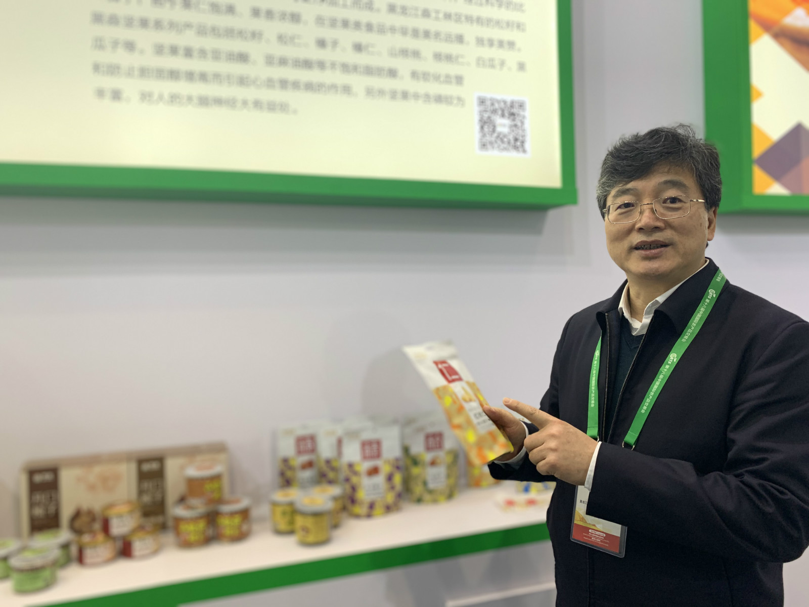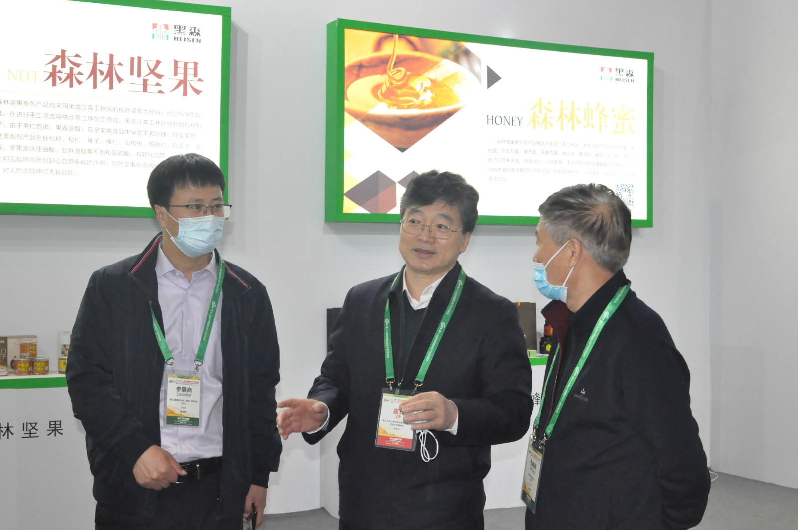 黑龍江森工森林食品集團張曉華黨委書記、董事長張曉華(中)與參展企業交流