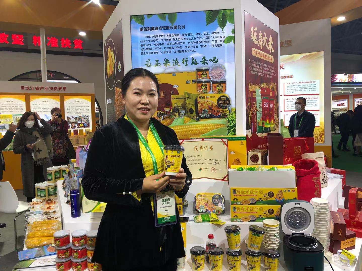 第十八屆中國國際農產品交易會(以下簡稱「農交會」)在重慶國際博覽中心盛大開幕。在黑龍江省扶貧展區,有來自全省20個國貧縣的特色優質農產品參展,這些產品均產自農民小菜園、小果園,綠色無污染,安全優質健康。哈爾濱健康農牧業有限公司帶來的玉米深加工產品——即食大碴粥、玉米南瓜羹、米飯伴侶等展品,受到市民青睞。首次參展的哈爾濱健康農牧業有限公司董事長孫立娟表示,「來到這個扶貧展, 和之前參加過的展示不一樣。因為我們是參加了一場沒有硝煙的戰爭,感覺是非常自豪的。開幕當天一上午就有來自西安、吉林、江西等地的扶貧產品超市跟我們來對接,收穫很大。」
