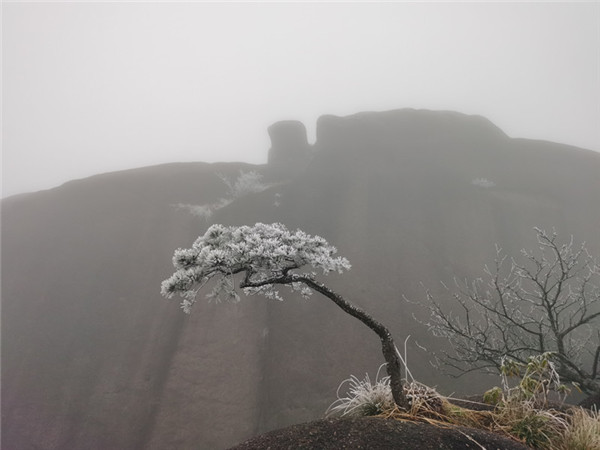霧凇是黃山冬季的天然奇景,當氣溫下降到0℃以下,有霧或毛毛雨天氣時,樹木、石塊等物體附著的凍結物,氣象學上稱為霧凇。黃山高海拔景區平均每年有霧凇62.9天,一般集中在11月下旬到次年的3月上旬。