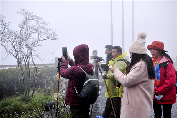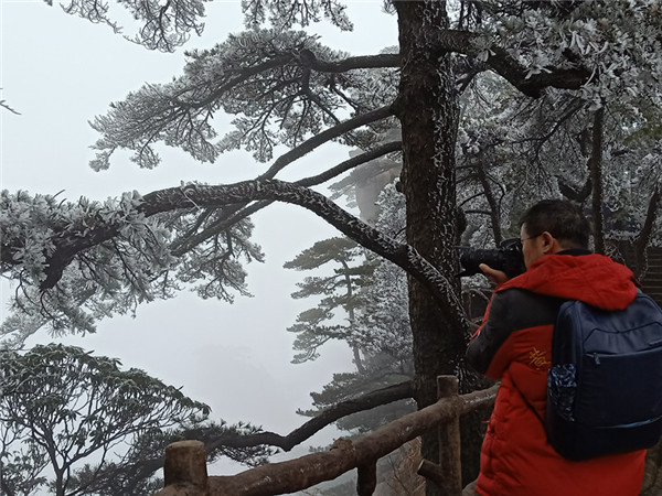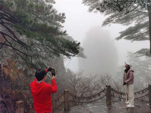 廣州遊客張女士和閨蜜第一次來到黃山,她覺得很幸運、很開心,遇到了霧凇。她認為黃山是一個很值得來的地方,以後還會來體驗不同季節的黃山。