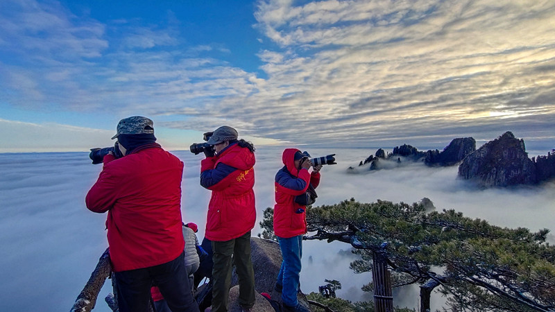 11月29日清晨,雪後初霽,藍天白雲之下,松針晶瑩剔透,霧凇、雲海、佛光齊現。風止時,雲海波平浪靜,浩瀚無垠,峰尖浮海,猶如孤島;風起時,銀浪翻滾,波濤湧動,驚濤裂岸;有時雲海漫過山崖,如同瀑布飛泄,白練垂空。遊客置身黃山,如在仙境,紛紛駐足拍照留影,露出開心的笑顏。
