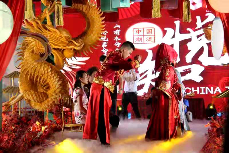 當天下午,各式潮流婚禮及裝飾布置應接不暇,伴隨着輕柔的音樂,在頂級大咖的主持下,活動拉開序幕。身材高挑靚麗的模特穿着中西式婚紗禮服登台亮相,一款款獨特而浪漫、張揚而又不失優雅的國潮婚紗呈現在現場近百位準新人們的眼前。活動中穿插品禮、觀帔、創意甜品、幸運抽獎等精彩互動,聯合婚禮策劃、服飾、主持等眾多相關企業強強聯手,為準新人們提供一站式備婚服務。