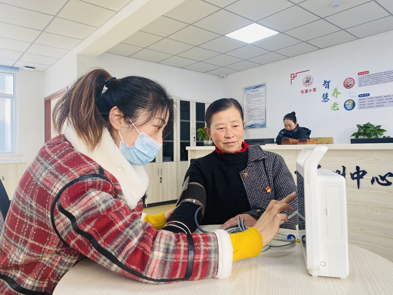 11月30日,在安徽黄山市屯溪區昱中街道屯溪小哥智慧養老綜合服務平臺中心,工作人員正在給轄區內的老年人進行健康體檢和智能定位。