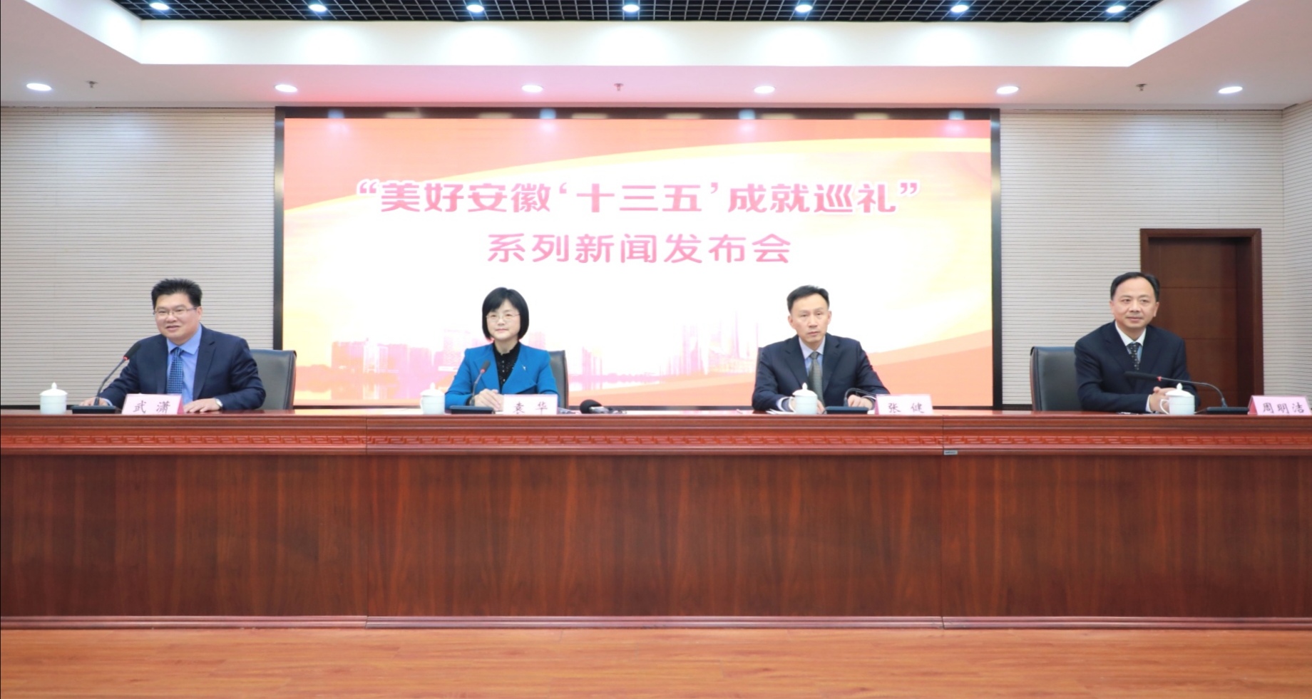 「美好安徽『十三五』成就巡禮」系列新聞發佈會(第九場),左起:安徽省委宣傳部新聞發佈處處長武瀟主持發佈會,省文化和旅遊廳廳長袁華,省文化和旅遊廳副廳長張健,省文化和旅遊廳副廳長周明傑先後介紹相關情況並回答記者提問(孫軍/攝)
