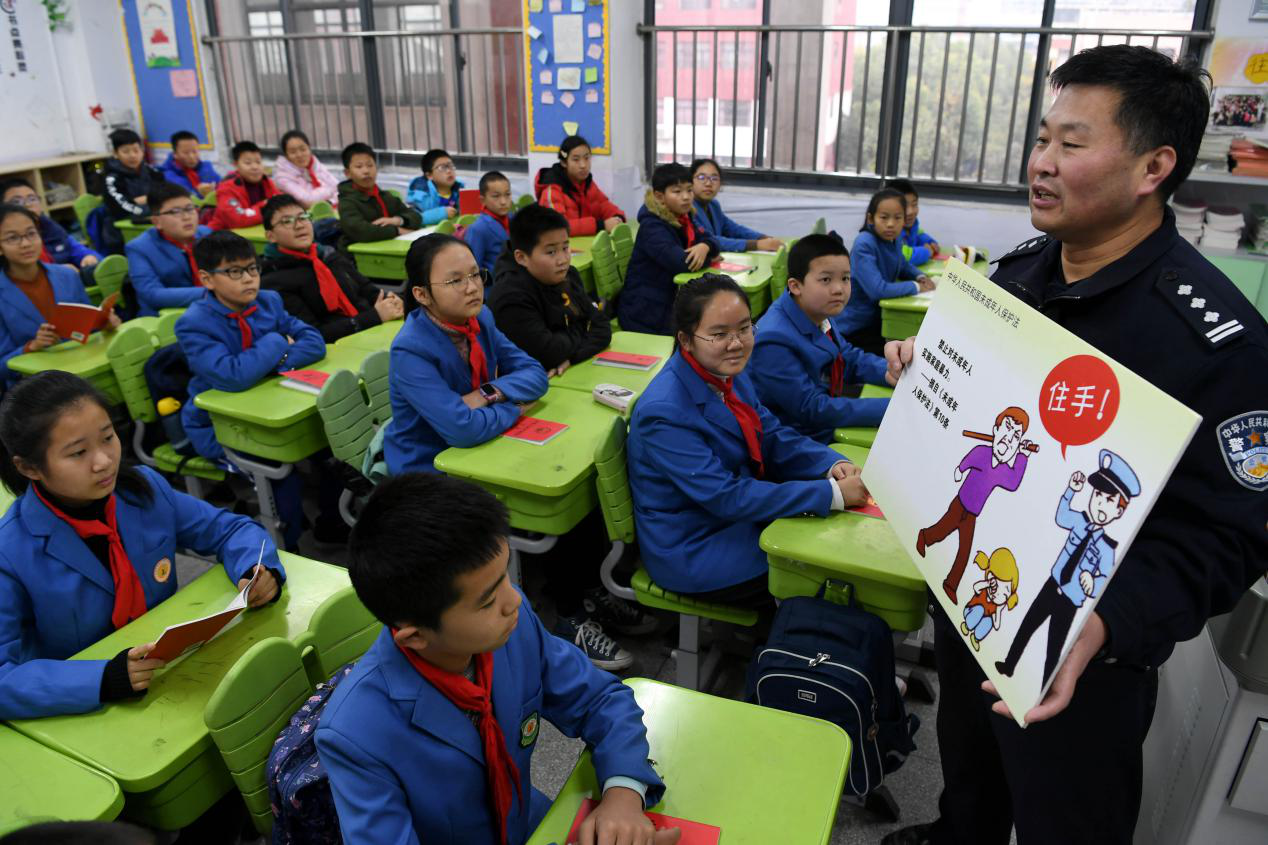 12月2日,在合肥市瑤海區蚌埠路第二小學,小學生在王軍警官的帶領下學習未成年人保護法等法律知識(謝琛/攝)