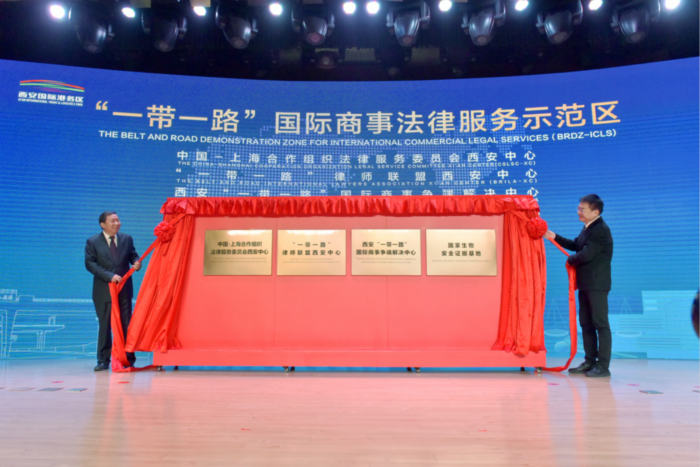 12月1日,司法部、陝西省人民政府共同舉辦的中國—上海合作組織法律服務委員會西安中心、「一帶一路」律師聯盟西安中心、西安「一帶一路」國際商事爭端解決中心和國家生物安全證據基地揭牌儀式在西安國際港務區舉行。「三個中心一個基地」設立將為「一帶一路」國際商事法律服務示範區建設和功能發揮提供重要支撐。司法部副部長熊選國,陝西省委常委、常務副省長梁桂共同為「三個中心」「一個基地」揭牌。