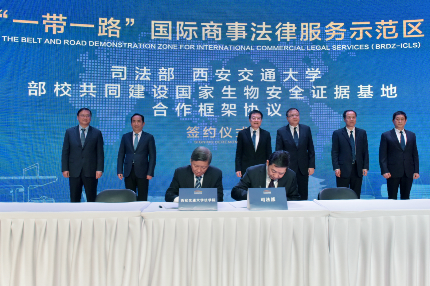 簽約儀式上,司法部與西安交通大學簽署共同建設國家生物安全證據基地合作框架協議。西安國際港務區管委會與西安交通大學法學院、清華大學法學院、絲綢之路區域合作與發展法律研究院簽署戰略合作備忘錄,與大成律師事務所、上海段和段律師事務所、北京金杜律師事務所、陝西永嘉信律師事務所簽約入駐西安「一帶一路」國際商事法律服務示範區。(記者 胡秦玉)