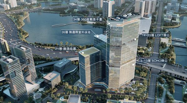 2019年1月,項目完成主體結構封頂,今年10月正式對外發售。項目的一二層為商業部分,共計5000平方米。三層以上為辦公寫字樓和公寓,產品涵蓋3.2米SOHO、5米LOFT,單套面積從88-225m2不等,空間靈活。令人驚歎的是,廣場南北兩座塔樓中間80-100米處,採用「一」字形結構建設了一條跨度15米的空中連廊,連廊上方更打造出無邊際室外泳池。在34層的360°觀景平台俯瞰南沙核心區,城市風景盡收眼底,國際化品味盡顯風采。