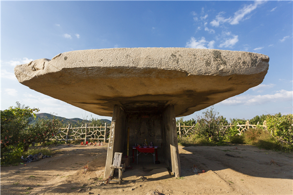 建造石棚,究竟有何目的?有說石棚是先祖墓葬,有說是祭祀所用。從石棚上刻的古字足以溯源。考查發現:在它的蓋石外部隱約可見鐫有四個原始文字符號——「天」「地」「示」「首」,由此又進一步證明了石棚是古代原始社會部落首領聯盟舉行「禪讓」「加冕」「祭祀」的禮儀場所,也是古代原始社會「禪讓制」的實物見證。清代該石棚曾被當作廟宇利用,故又名「古雲寺」。