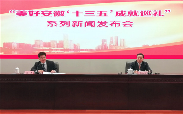 「美好安徽『十三五』成就巡禮」系列新聞發佈會(第十四場),安徽省委宣傳部新聞發佈處處長武瀟(左)主持發佈會,省自然資源廳副廳長郜紅建介紹相關情況並回答記者提問(孫軍/攝)