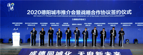 12月9日上午,以「成德同城化·天府新未來」為主題的2020德陽城市推介會在成都舉行,來自全國各地的大型央企國企、知名民企、重要行業協會代表和川渝黨政代表齊聚一堂,在成渝地區雙城經濟圈建設和成德眉資同城化國省戰略大背景下,共敘友誼、共話合作、共謀發展。