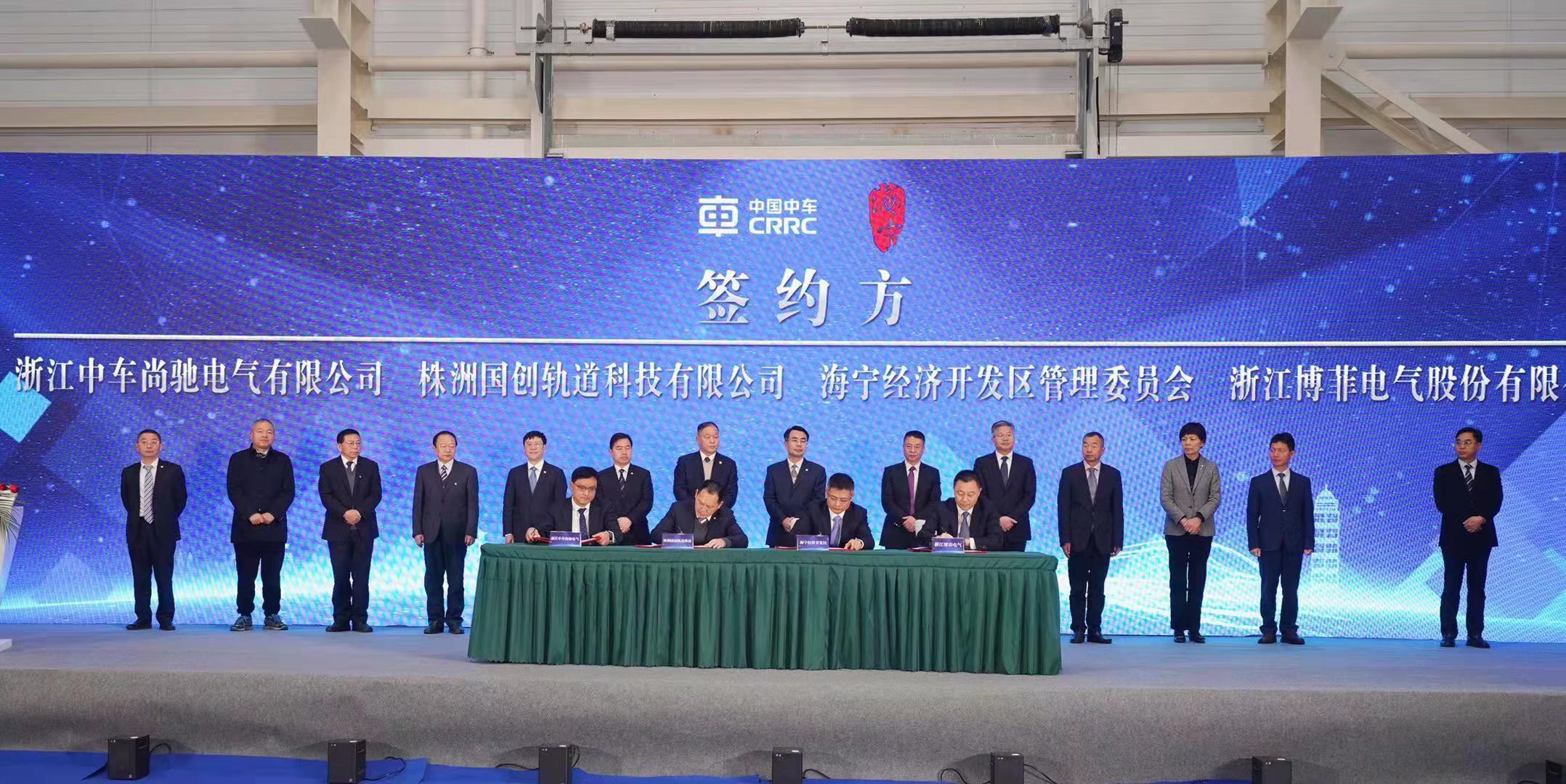 在現場嘉賓的共同見證下,浙江中車尚馳公司董事長、總經理范慶鋒與海寧經濟開發區管理委員會簽署了補充協議,與海寧經濟開發區管理委員會、株洲國創軌道科技有限公司、浙江博菲電氣有限公司簽訂了框架合作協議。
