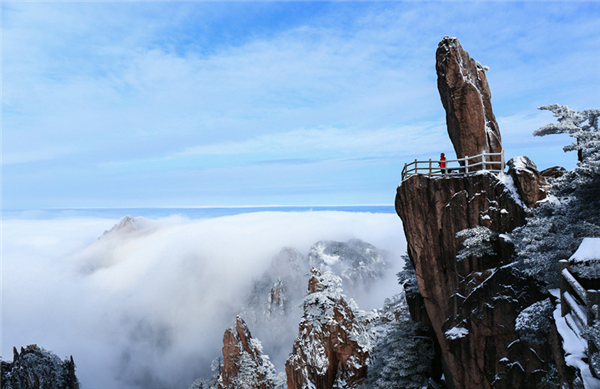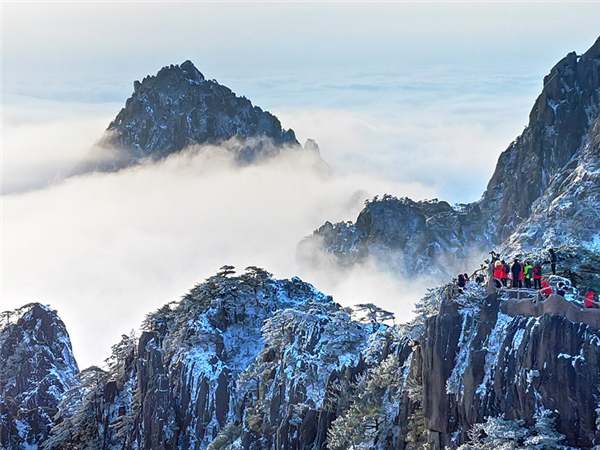 受冷空氣影響,12月13日夜裏,黃山風景區迎來入冬以來首場大雪,14日上午景區地面積雪深度達到5釐米。一夜之間,黃山換上了潔白的新裝,雪將群峰和奇松怪石妝點得銀裝素裹,五百里黃山宛如一幅壯觀的中國畫長卷。漫山的松、遍地的灌木,在霧凇、雪松的影響下都成為銀花盛開的玉樹,仿佛冰塑,棵棵黃山松宛若玉枝垂掛,簇簇松針恰似銀菊怒放,晶瑩多姿。