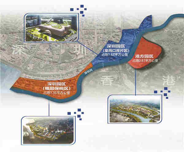 小地方孕育着大希望,可以有大作為。合作區位於深圳市福田區南部與香港特別行政區接壤處,約4平方公里,包括港方區域和深方區域。其中,深圳河南側的港方區域,原為深圳河治理截彎取直後形成的一塊「飛地」,由深圳河新舊河道圍合而成,面積約0.87平方公里,位於香港境內;深圳河北側的深方區域約3.02平方公里,位於深圳境內。