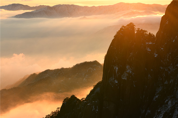 雲海、冬雪皆在黃山“五絕”之列,兩種景觀一齊出現為冬日黃山增色不少。聳峙的山峰覆蓋著深淺不一的白雪,更添凜冽的威嚴。山上的雪順著千松萬石次第鋪開,陽光下張揚著黑與白的碰撞,一幅水墨中國畫躍然眼前。山腰的雲海氤氳湧動,連接著高山與天際,將整個黃山裝扮成蓬萊仙境。