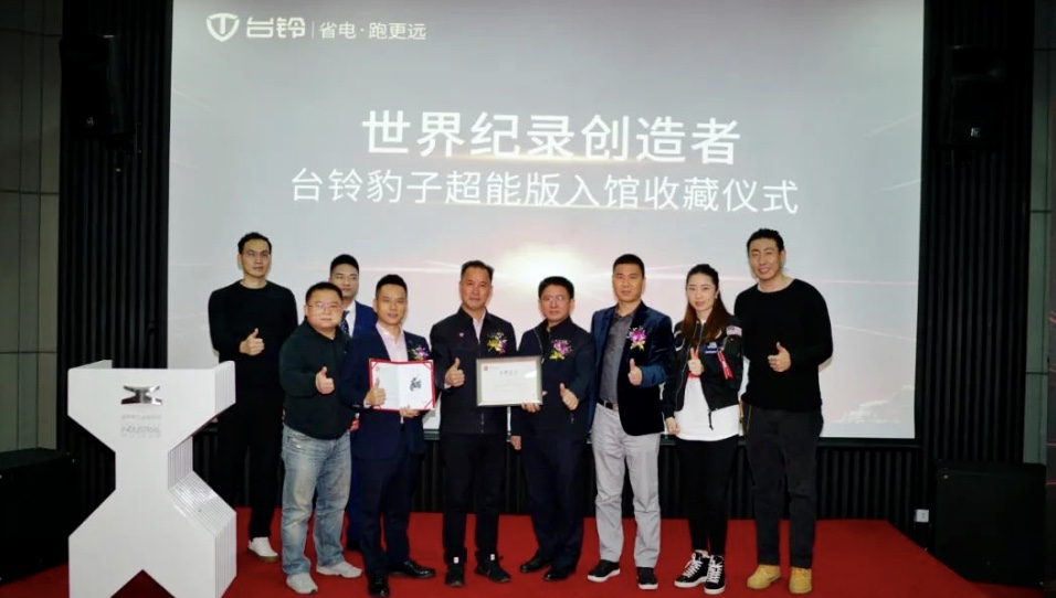 深圳市工業展覽館副館長潘文峰,深圳電動車產業促進委員會執行會長楊華,台鈴集團董事長孫木鉗、總裁助理兼公關總監胡東文及眾多媒體齊聚深圳市工業展覽館,參加了以「科技台鈴 超能領跑」為主題的世界紀錄創造者——台鈴豹子超能版入館收藏儀式。